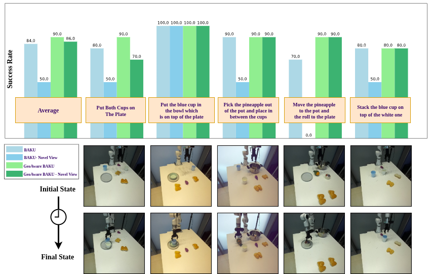 GeoAware variants improve zero-shot success on novel viewpoints across LIBERO subsets.